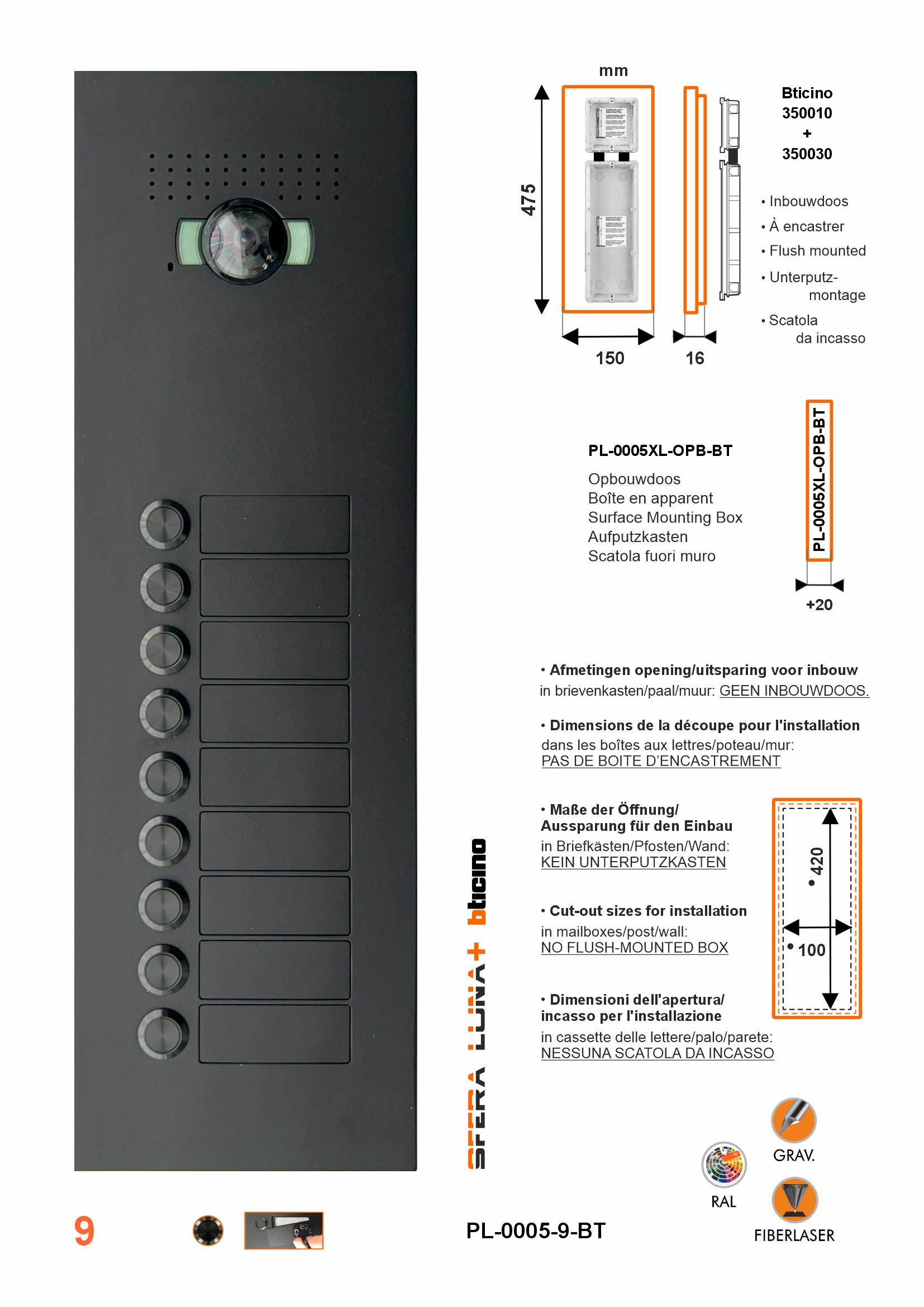 Frontale di pulsantiera videocitofonica SFERA LUNA+9 con 9 targhette portanome intercambiabili. Per pulsantiera Bticino 2 fili modulo audio video grandangolare 351500 angolo di visione: orizzontale 152°- verticale 96° Un design elegante e raffinato per l'ingresso della casa, dell'appartamento o del cancello .... Frontale di design standard in nero ral 9005 struttura fine. Disponibile in tutti i colori RAL corrispondenti al colore della Sua casa/progetto. Targhette portanome intercambiabili: un aspetto sempre uniforme alla Sua residenza o casa. 9 pulsanti di chiamata per casa doppia, appartamento o studio/applicazione privata. 9 targhette portanome sono facilmente intercambiabili grazie a un sistema di montaggio unico e invisibile. Le targhetta portanome possono essere personalizzate al momento dell'ordine o in un secondo momento. Realizzato in alluminio da 10 mm, finitura solida di alta qualità. Sistema di montaggio centrale previsto nel frontale. (montaggio semplice e invisibile) Resistente agli atti vandalici. (IP54 - IK08) Possibilità di installazione: da parete, su muri, cancelli, pali, cassette postali, ecc. Installazione facile in ambienti stretti. Modello da incasso su scatola standard Bticino 350030, disponibile anche con scatola fuori muro Possibilità di montaggio perfettamente orizzontale tramite fori oblunghi. Sfera Luna, partner del Gruppo Legrand (modello di copyright)