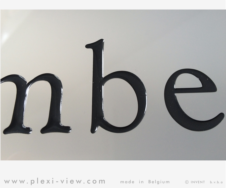 In slagvast acrylaat, gegraveerd, ingelakt, onbeperkt uitbreidbaar.