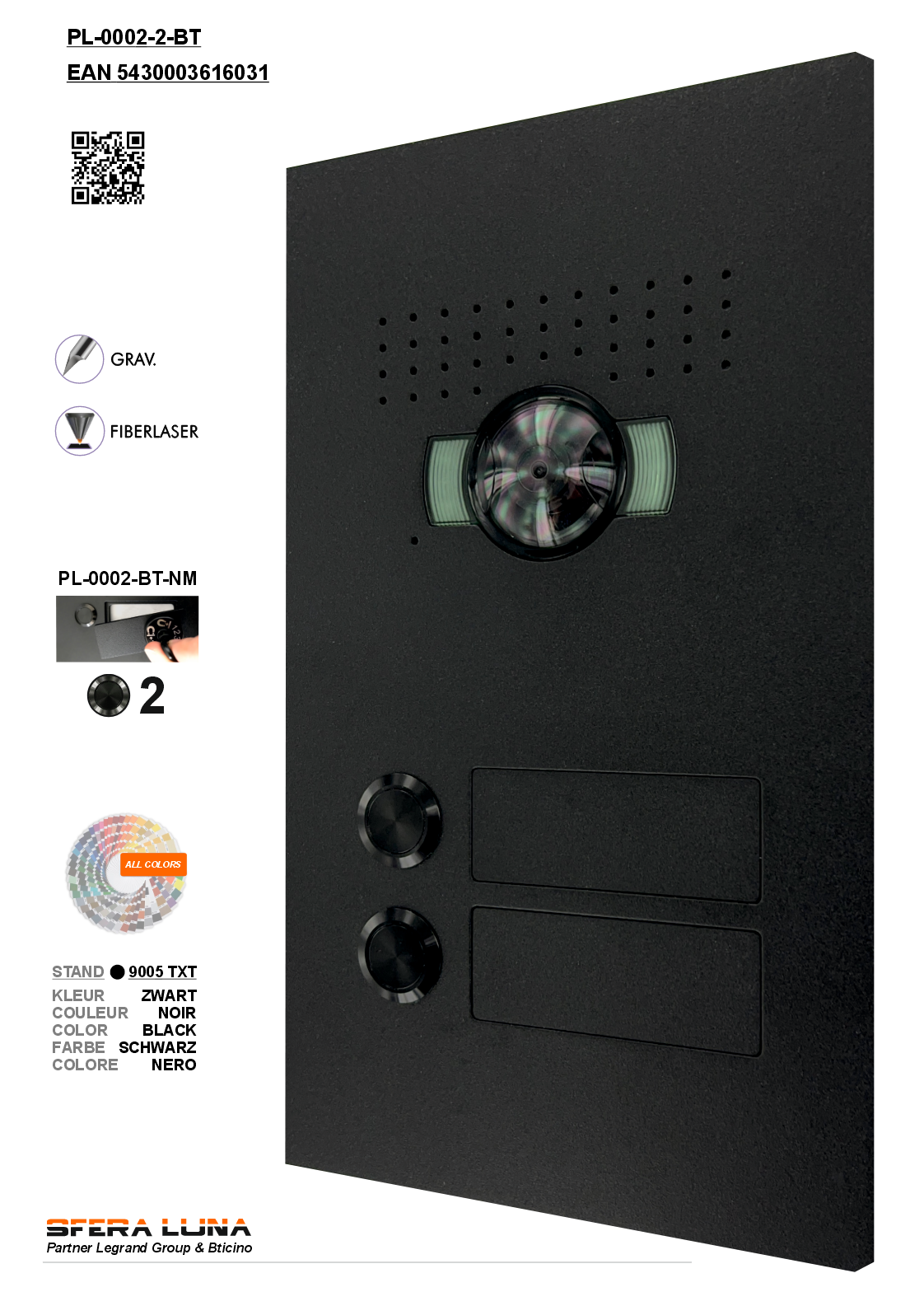 Frontplatte SFERA LUNA2 für Video Sprechanlage Bticino mit 2 abnehmbaren Namensschildern. Für Türstation Bticino mit Video-Lautsprechermodul 351500 in 2-Draht-Technik mit Weitwinkelkamera Erfassungsbereich: Horizontal 152°- Vertikal 96° Ein elegantes und stilvolles Design am Eingang Ihres Hauses, Ihrer Wohnung, Ihres Tores ... Design-Frontplatte serienmäßig in der Farbe schwarz ral 9005 fein strukturiert. Verfügbar in allen RAL-Farben, passend zur Farbe Ihres Hauses/Projekts. Wehselbares Namensschild: immer ein gepflegtes und einheitliches Erscheinungsbild für Ihre Wohnung oder Ihr Haus.