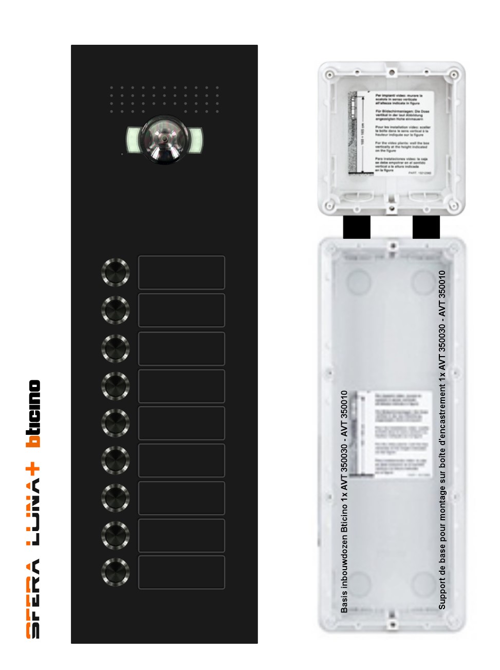 Platine de rue de vidéo-parlophonie SFERA LUNA+ 9 plaque nominative amovible. Pour poste extérieur Bticino 2 fils module audio/vidéo Bticino 351500 avec objectif grand angle angle de vue: horizontal 152°- vertical 96° Un design épuré. Elégant à l'entrée de votre maison, appartement, portail ... Platine de rue design, standard disponible en RAL 9005 structuré (structure fine) Ces platines de rue sont disponibles dans toutes les couleurs RAL, assorties avec la couleur RAL de votre maison ou projet. Avantage: des plaques nominatives amovibles, donnant à votre résidence/appartement un aspect soigné et uniforme Fabriqué en aluminium de 10mm, haut de gamme, finition solide. Plaques nominatives, faciles à changer grâce à un système de montage invisible. Les plaques nominatives peuvent être personnalisées au moment de la commande ou plus tard. Montage standard sur boîte d'encastrement Bticino 350030+350010, aussi disponible avec boîte en apparent Système de montage central en façade (montage simple en aveugle) Résistant au vandalisme. (IP54 - IK08) Possibilités d'installation: sur des murs, des portails, des poteaux, des boîtes aux lettres ... Installation facile en cas d'espace serré. Système d'encastrement unique, à encastrer dans des portails, des poteaux ...