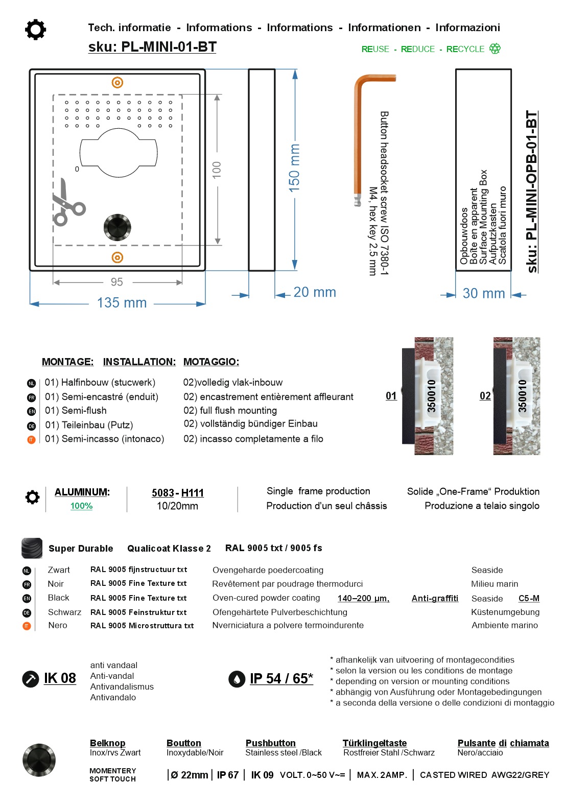 - All-in-One installation: fully recessed or semi-surface (20 mm) with the same module (on flush-mount box 350010)