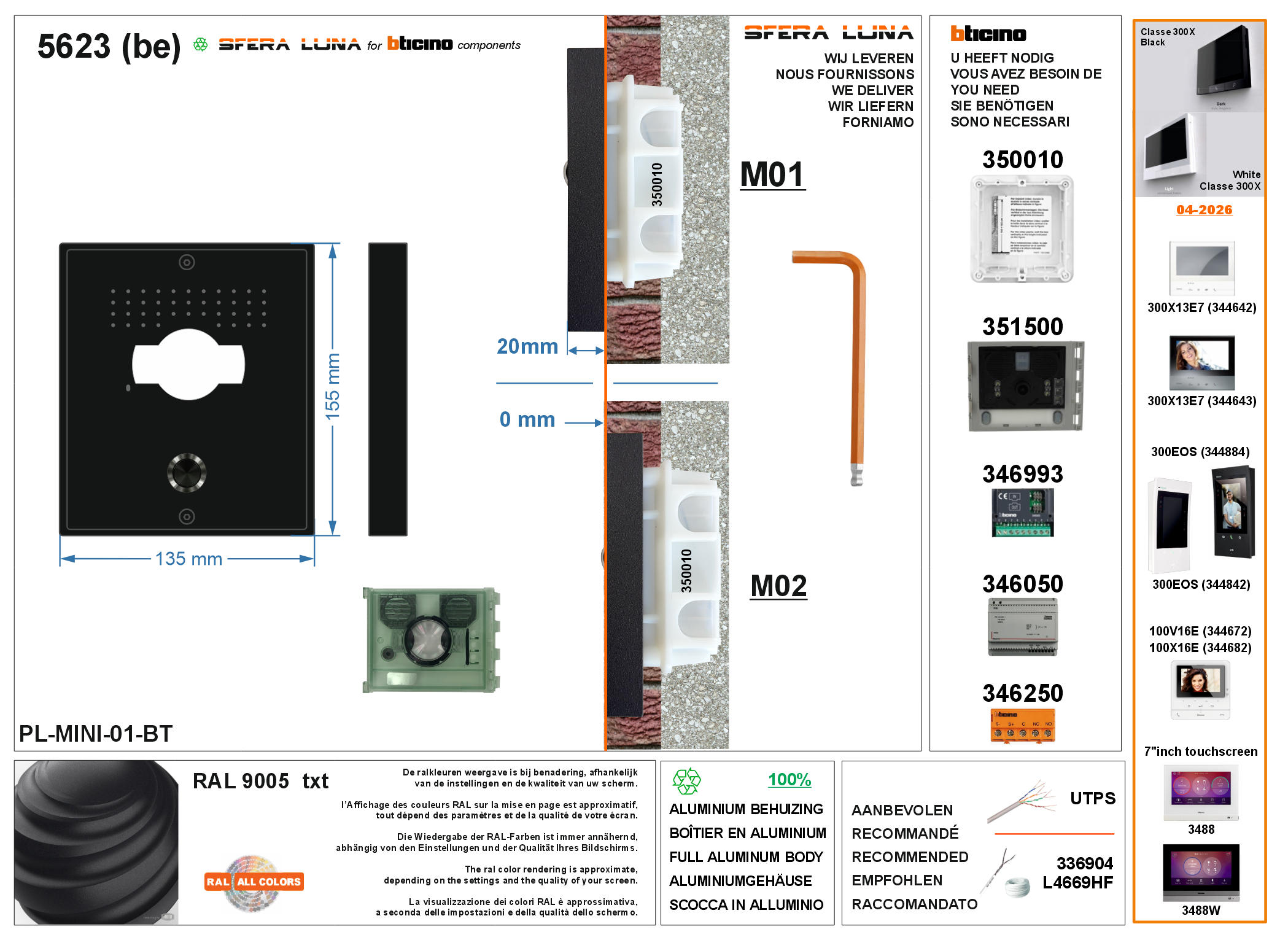 Perfect compatibility with Bticino 2-wire audio/video modules 351300 & 351500.