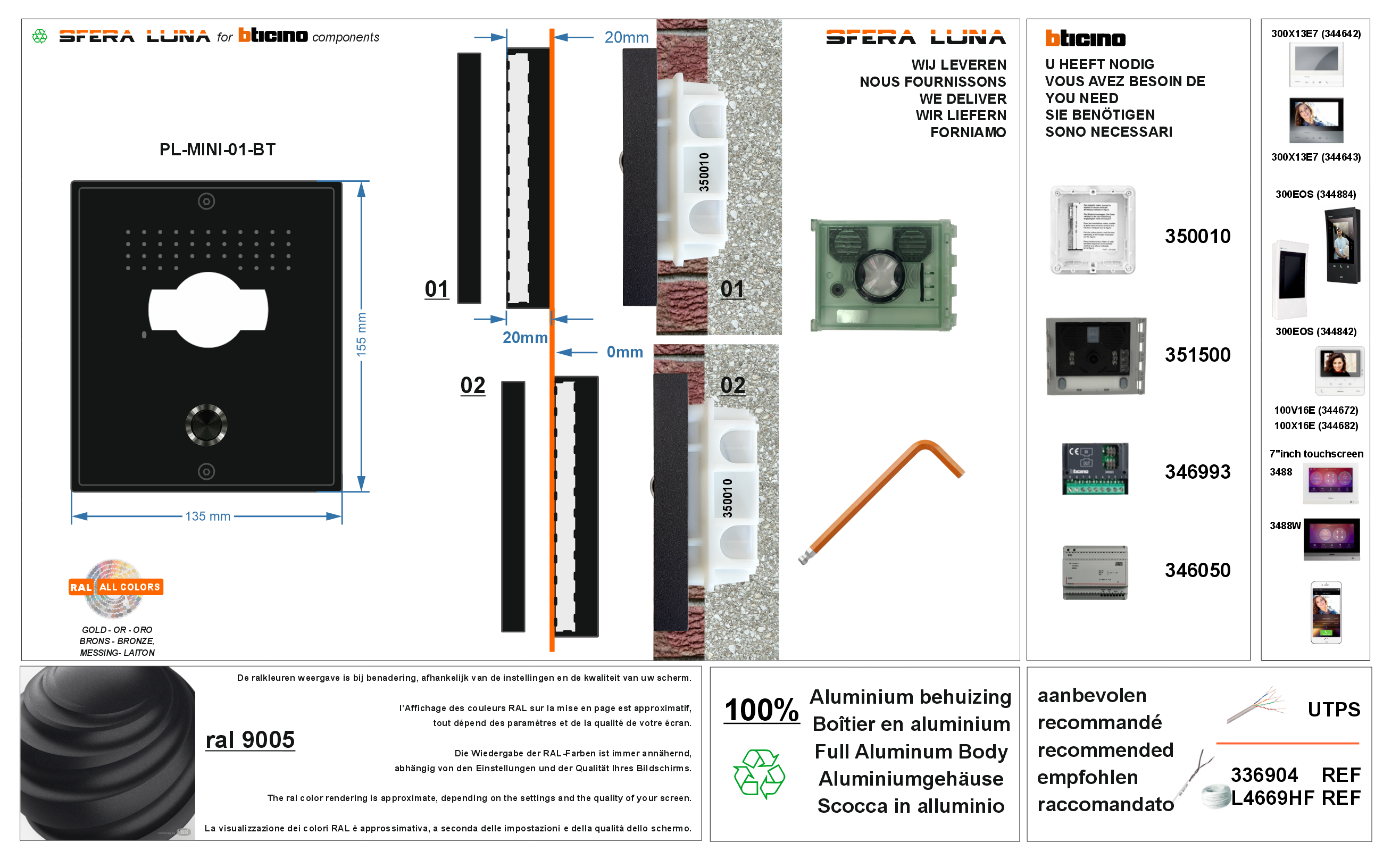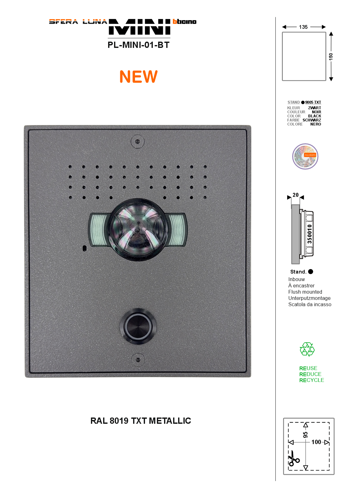 - Installazione tutto-in-uno: completamente incassato o semi-a-parete (20 mm) con lo stesso modulo (su scatola da incasso 350010)